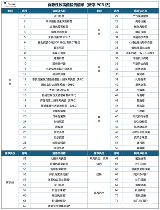 小海龟超多重数字PCR可精准定量病原体,覆盖细菌、病毒、真菌等60余种食源性致病菌(如沙门氏菌、单增李斯特菌、诺如病毒等),可实现15重病原体合并单管检测,满足绝大多数检测需求。
