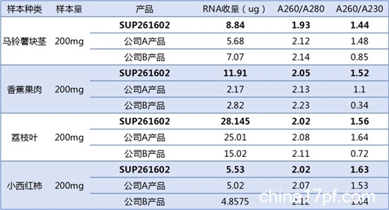 1、使用SUP261602、公司A产品和公司B产品对不同植物组织样本进行RNA提取,结果显示SUP261602提取得到的RNA收量较多,纯度较好。